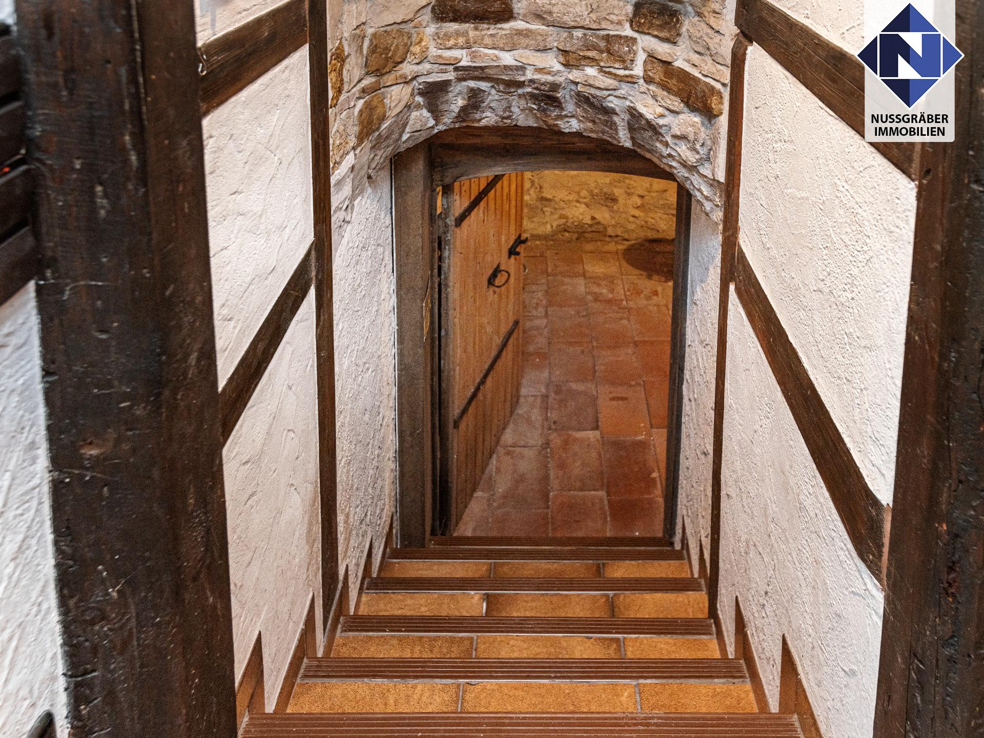 Im Untergeschoss steht ein weiteres Zimmer zur Verfügung, dann gibt es noch einen wunderbaren Gewölbekeller, ein kleines Bad mit Dusche und WC, einen Heizraum und eine große Diele.