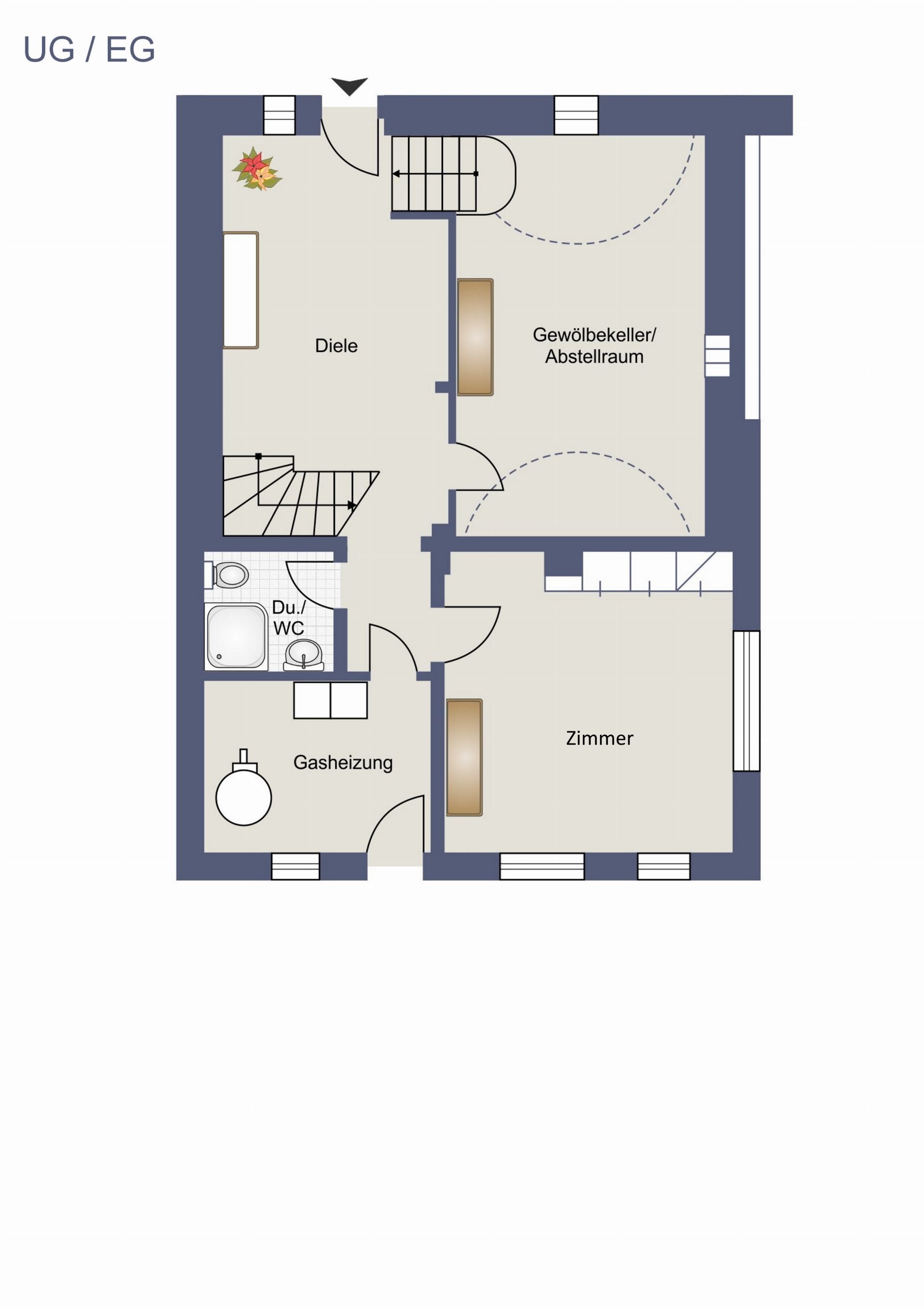 UG / EG: Gewölbekeller, Zimmer, große Diele, Bad mit Dusche und WC, Heizraum,