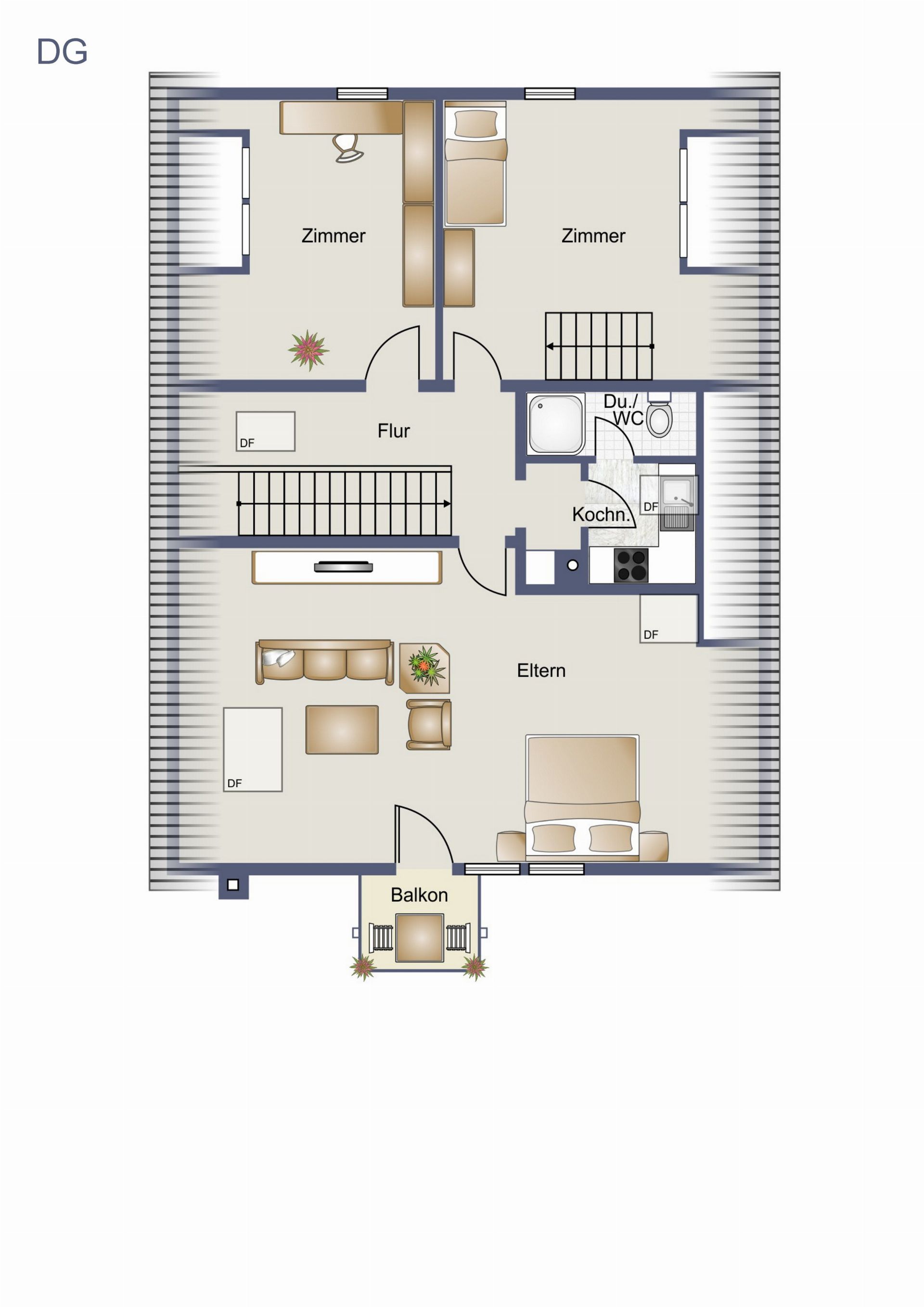 DG: 3 Zimmer, Balkon, Kochnische, Bad mit Dusche und WC, Flur - Bühne im Dachspitz