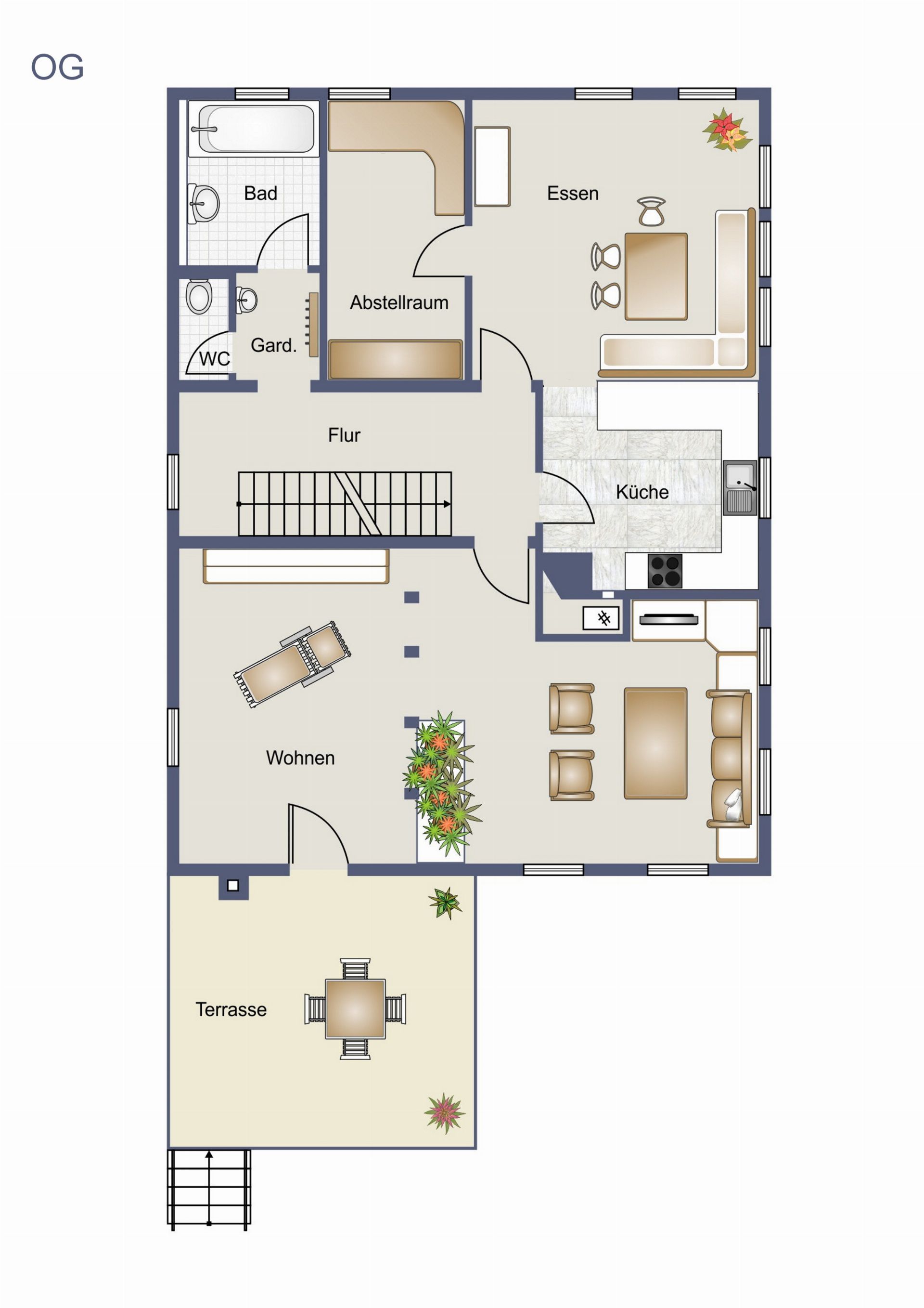 OG: großer Wohnbereich, angrenzende große Terrasse, Esszimmer, Küche, Abstellraum, Garderobe, Bad, WC und Flur