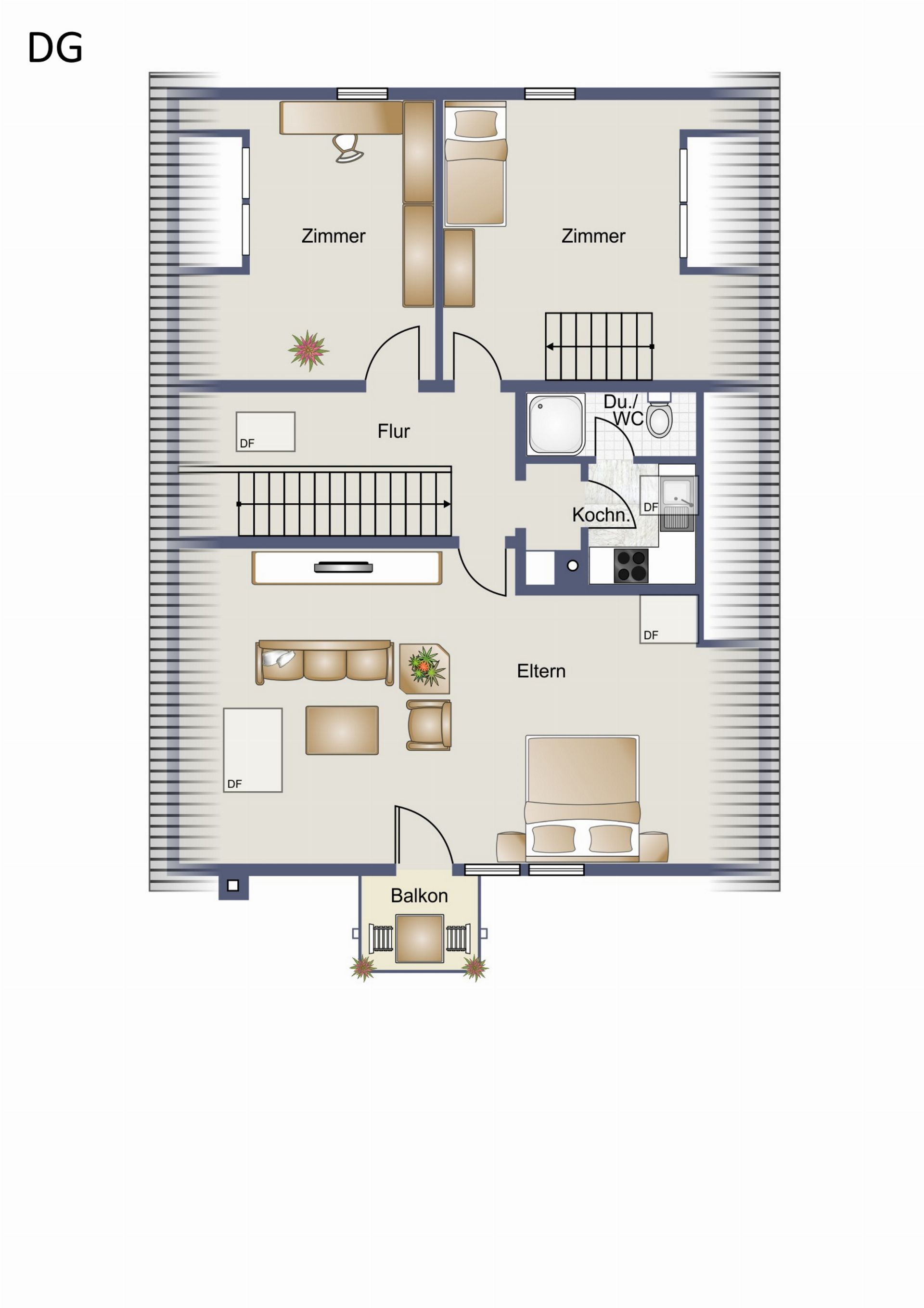 Im Dachgeschoss befinden sich die Räume zur individuellen Nutzung. Ein großes Zimmer mit Balkon und zwei weitere Zimmer freuen sich auf neue Bewohner. Eine kleine Kochnische sowie ein Bad mit Dusche und WC vervollständigen das Dachgeschoss.