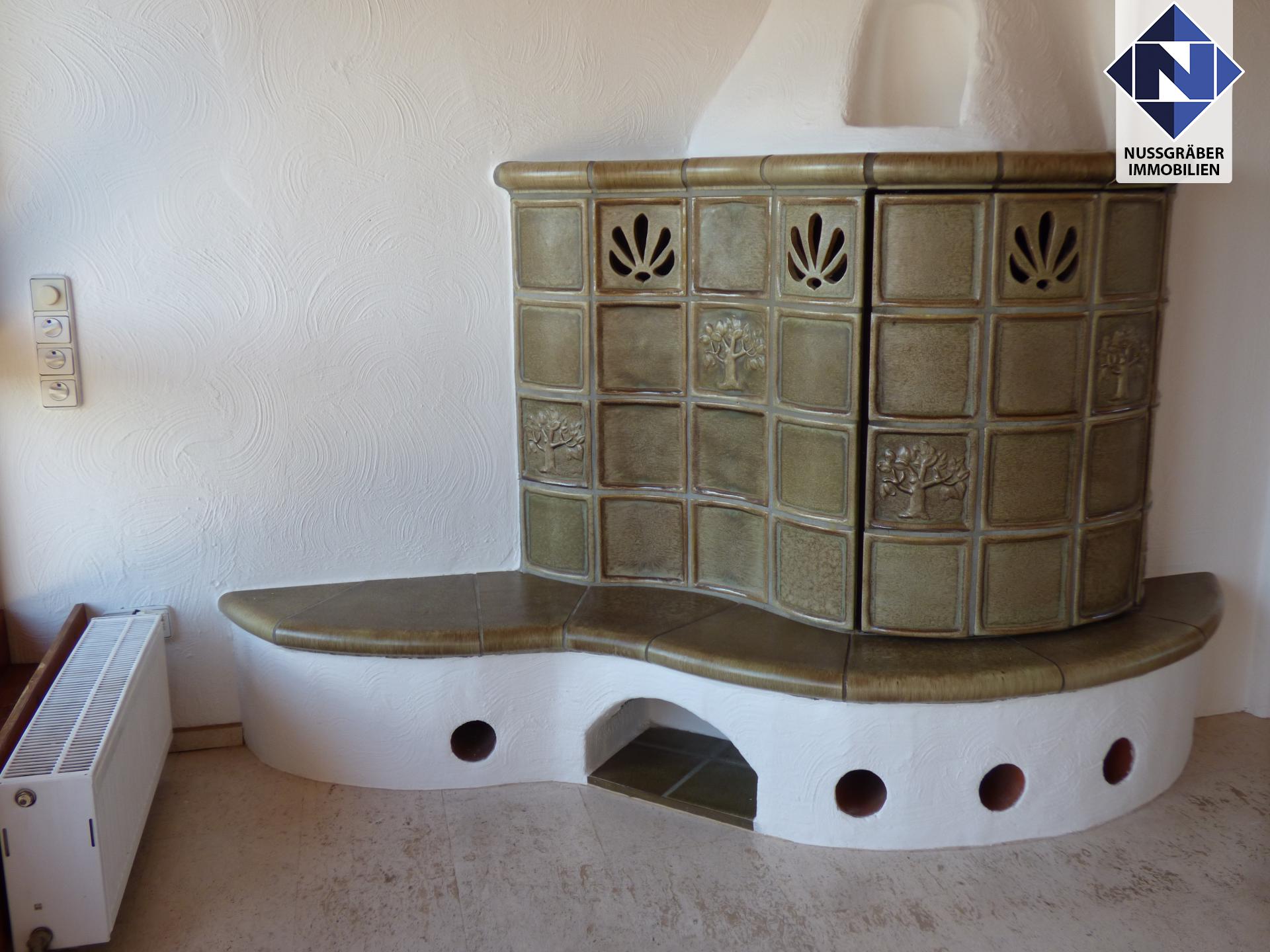 Ein im Wohnbereich integrierter Kachelofen bringt wohlige Wärme wenn es kälter wird.