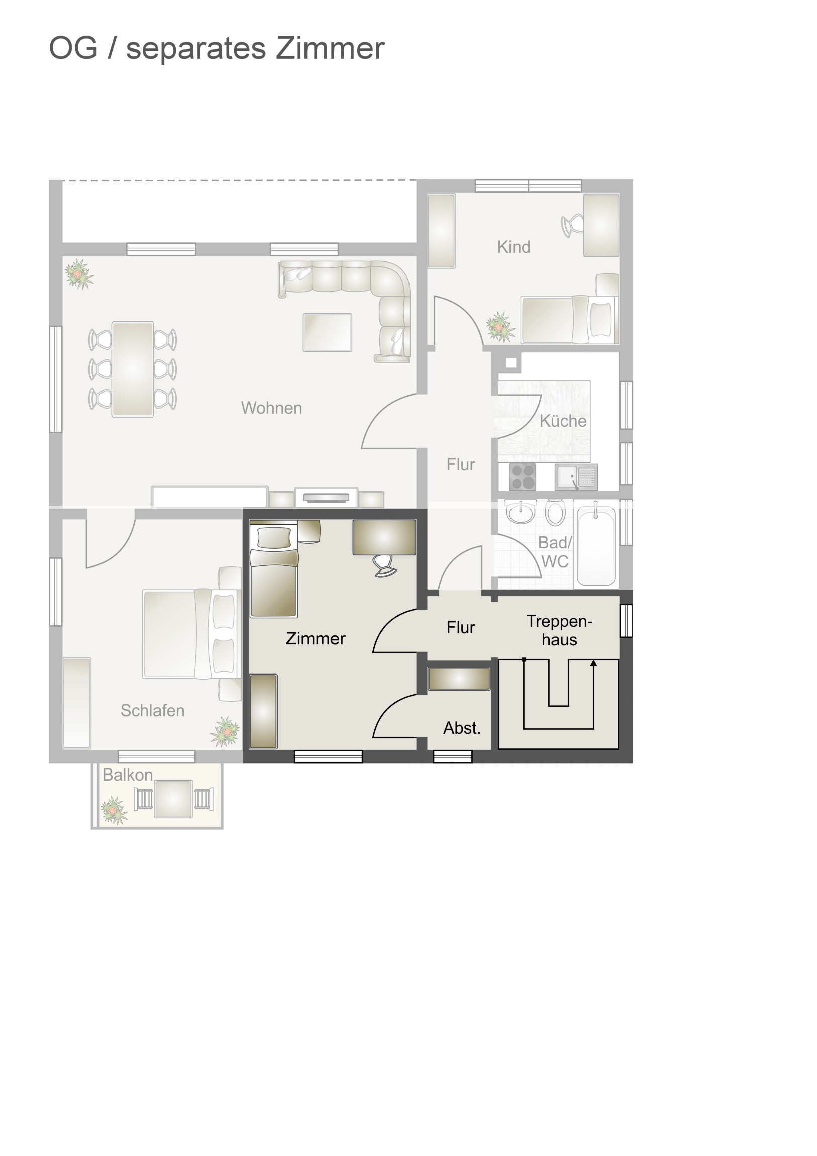 Das vierte Zimmer, mit kleinem Abstellraum, befindet sich eine Etage tiefer im Obergeschoss.