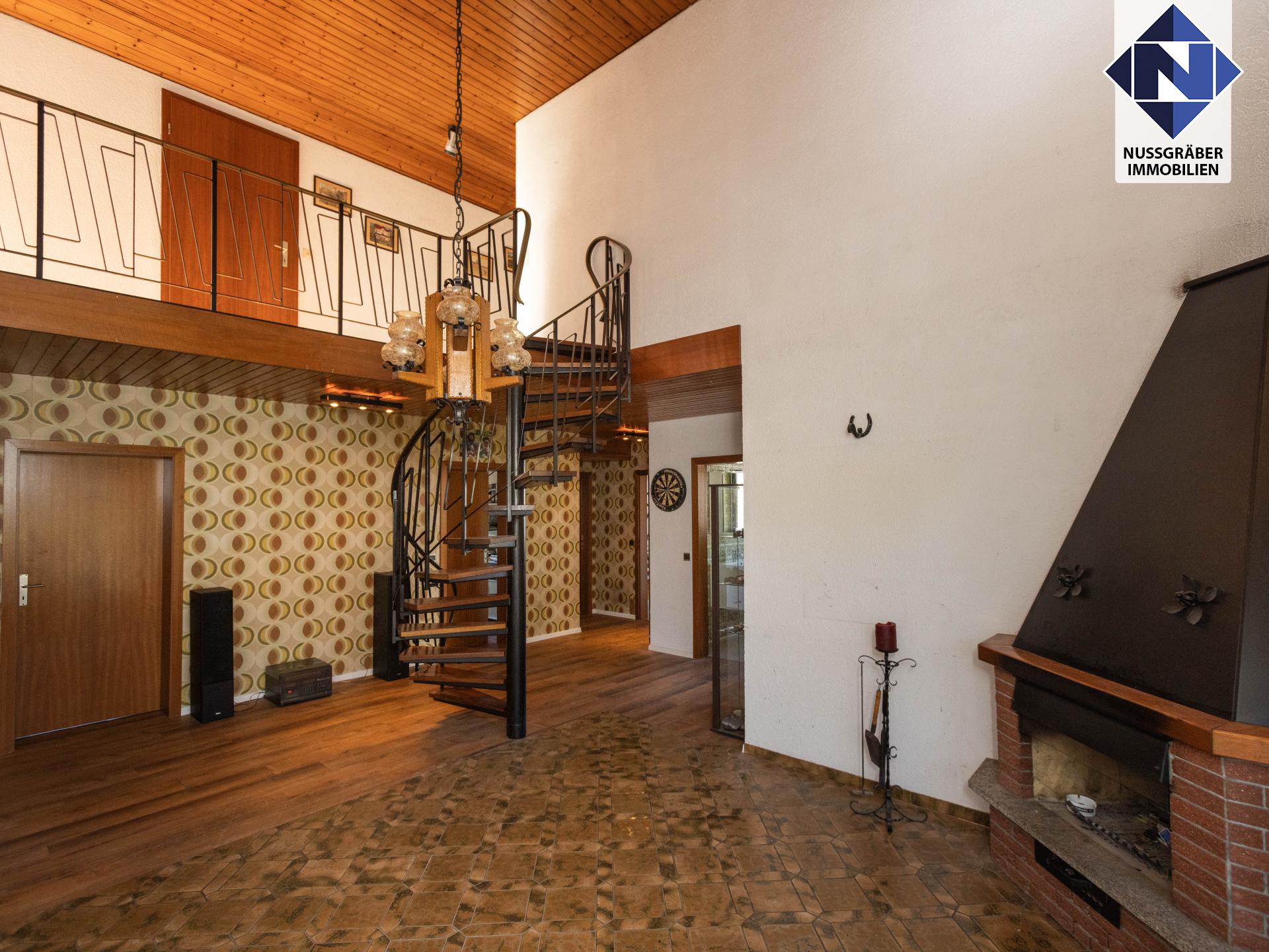Durch die leichte Hanglage befindet sich das Herzstück des Hauses im Gartengeschoss Hier empfängt Sie ein imposanter und großer Dielenbereich mit offenem Kamin und direktem Zugang auf die Terrasse und in den Garten.