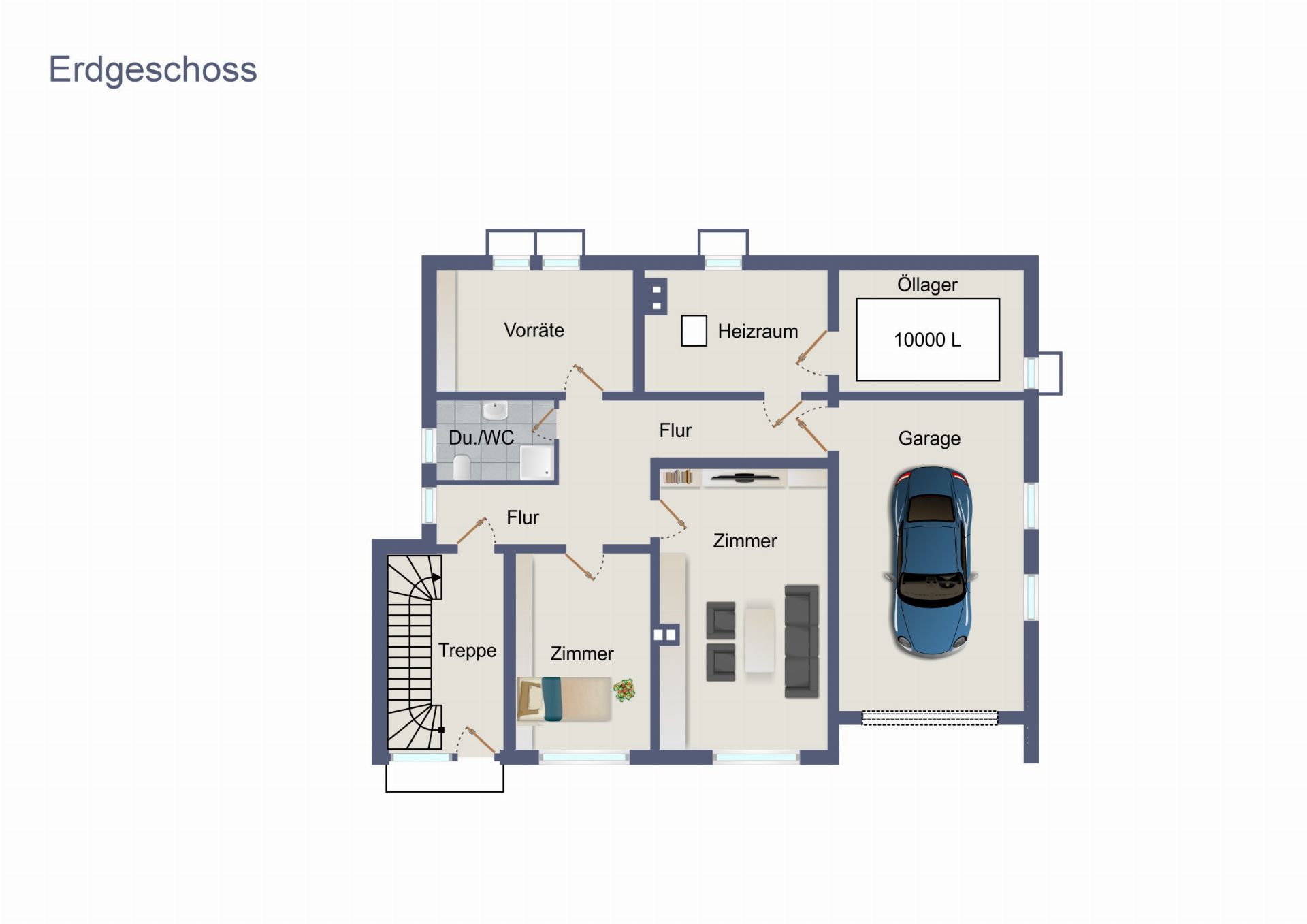 EG: 2 Zimmer, kleines Bad, Vorratsraum, Heizraum, Öllager, Treppenhaus, Flur, Garage