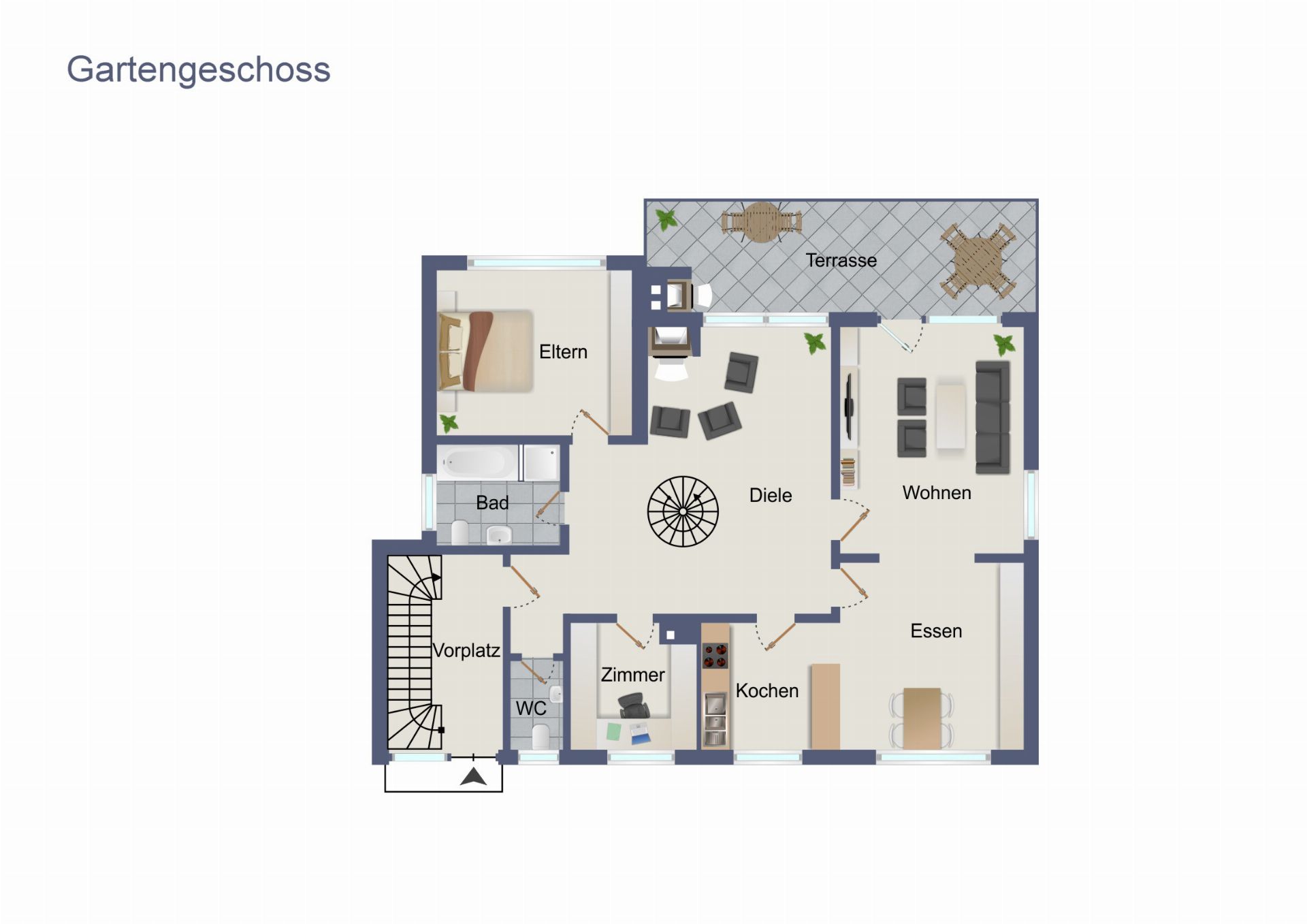 GG: Wohn- Esszimmer, offene Küche, 2 Zimmer, große Diele, Bad, Gäste-WC, Terrasse, Garten