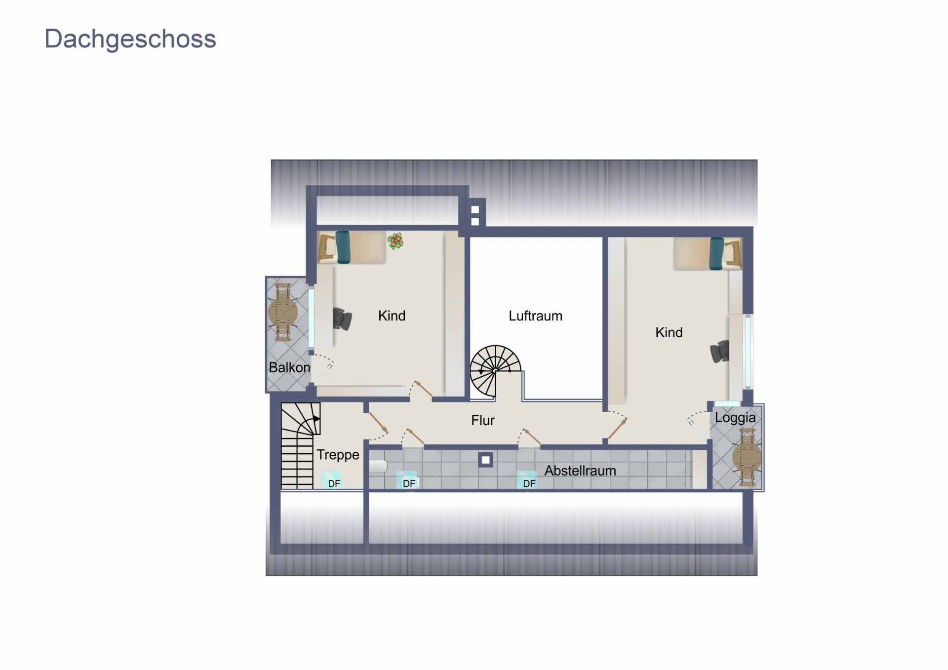 Das Dachgeschoss erreicht man über das Treppenhaus oder über die Wendeltreppe in der Diele, diese führt auf eine kleine Galerie. Hier gibt es zwei weitere Zimmer, eines davon mit Balkon und das andere mit kleiner Loggia.