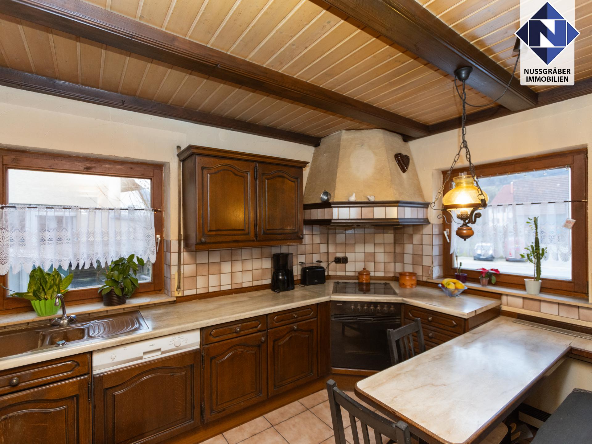 Die angrenzende, rustikale Einbauküche ist sehr geräumig und bietet einen weiteren Essbereich mit einer gemütlichen Sitzecke.