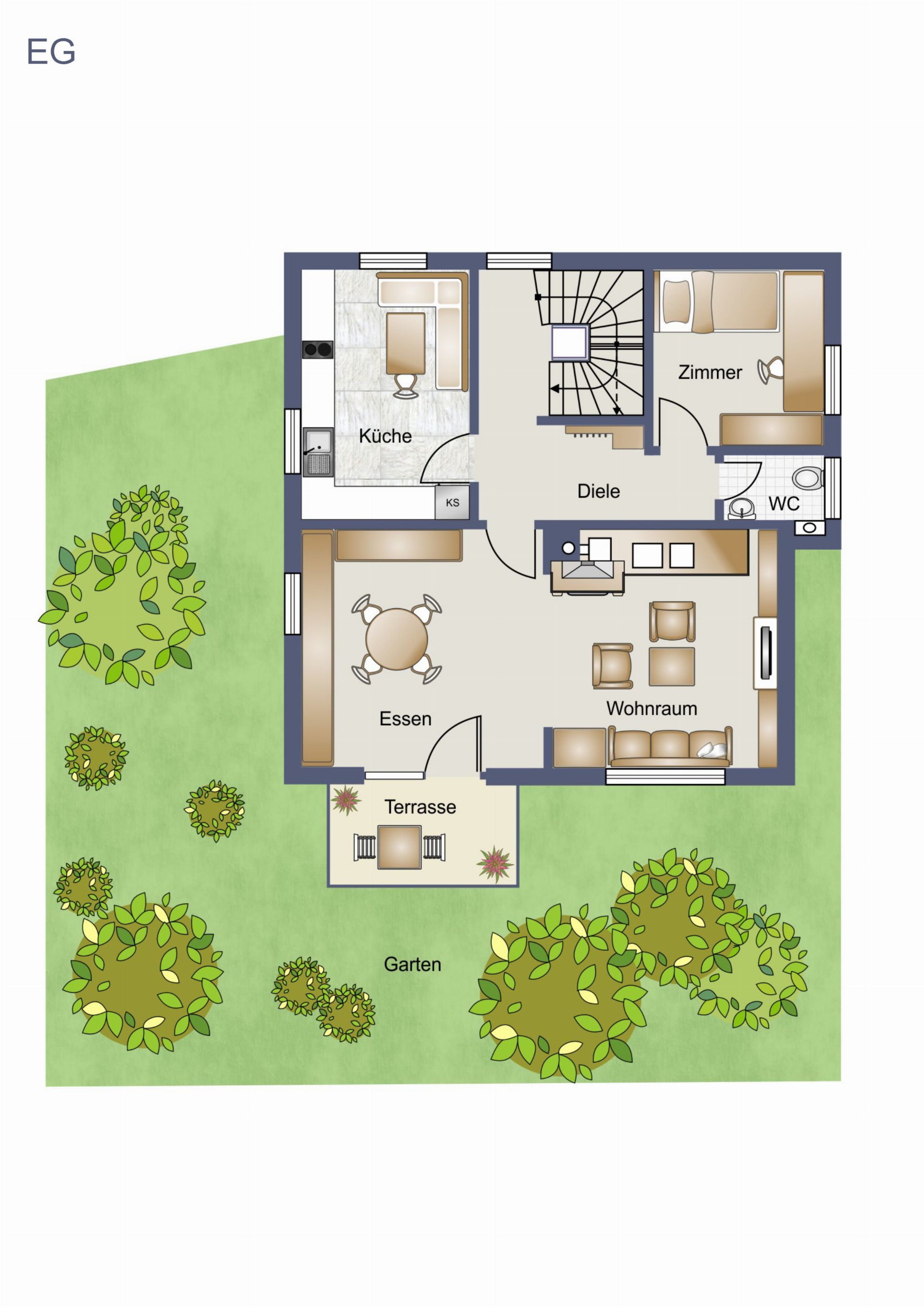 EG: Wohn- Esszimmer, Terrasse, Diele, Zimmer, Küche, Gäste-WC, Treppenhaus
