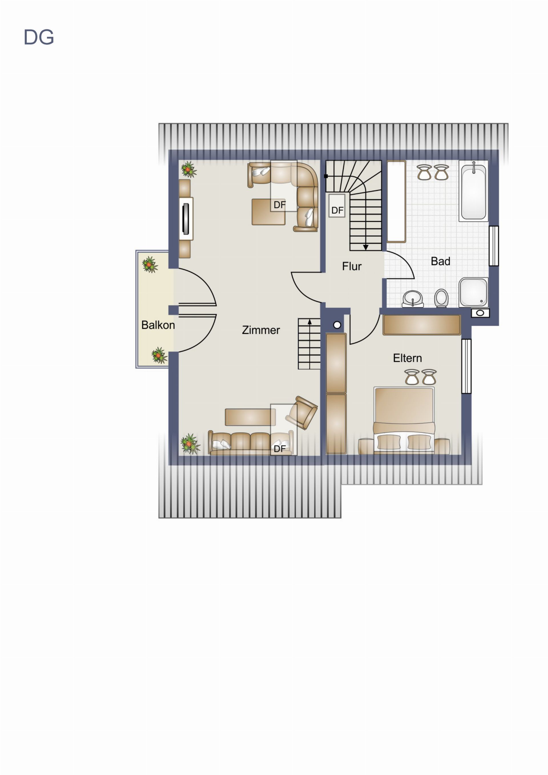 DG: großes Zimmer mit Balkon, weiteres Zimmer, Flur und Tageslicht-Bad