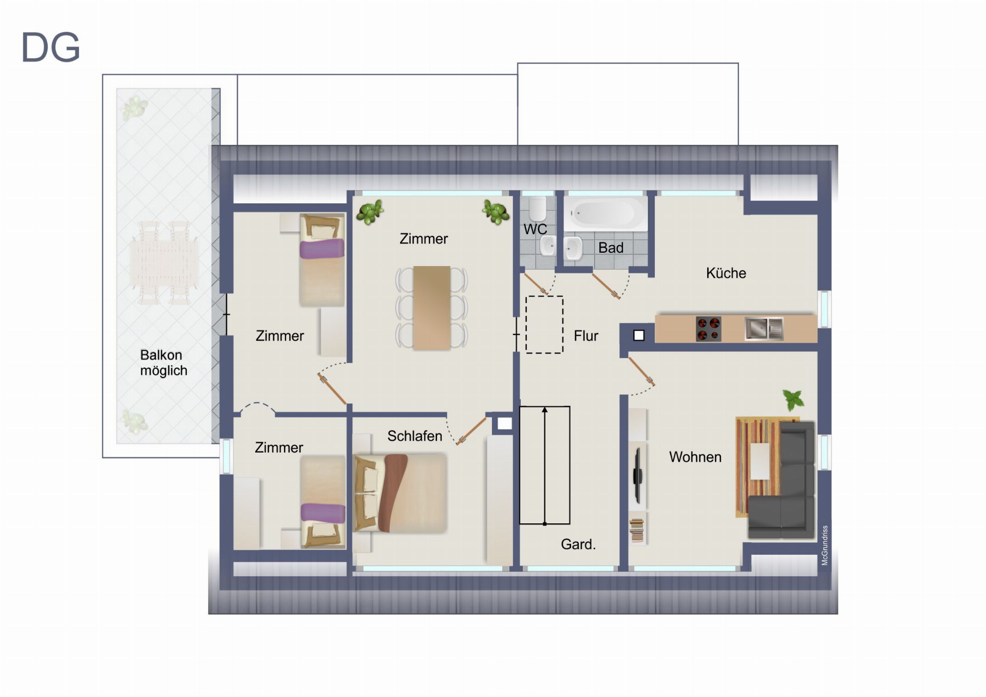 Die Wohnung bietet Ihnen viereinhalb bis fünf Zimmer. Ein Balkon kann optional noch erweitert werden.