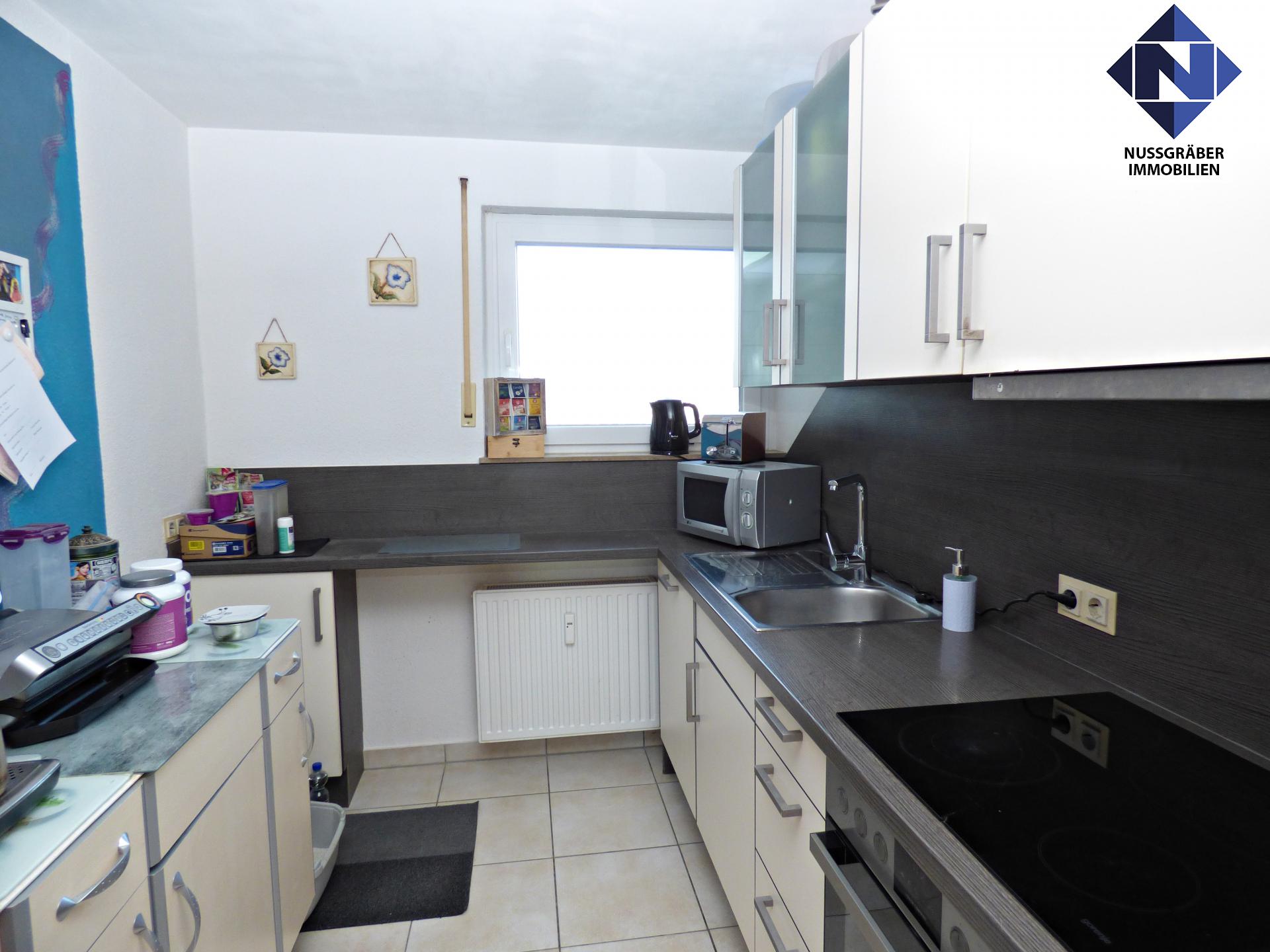 Die moderne Küche ist in Weiß / Grau gestaltet und bietet ausreichend Arbeitsfläche und Stauraum. Im Tageslicht-Bad findet eine Badewanne und eine Dusche Ihren Platz.